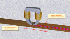 Записывающая магнитная головка представляет собой электромагнит - сердечник из магнито - мягкого материала с намотанным на него проводом. Когда мы пропускаем по проводу ток, сердечник намагничивается. Ток пропадает - магнитное поле исчезает. Сердечник имеет зазор, где силовые линии магнитного поля выходят за пределы сердечника.