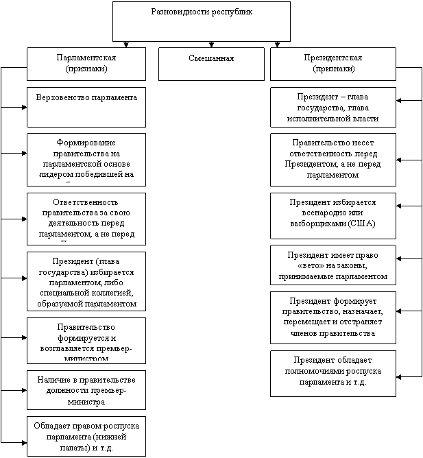 В качестве современных форм республиканского правления рассматриваются президентские (США, Франция, Филиппины, Мексика и др.) и парламентские (Италия, ФРГ и др.) республики.