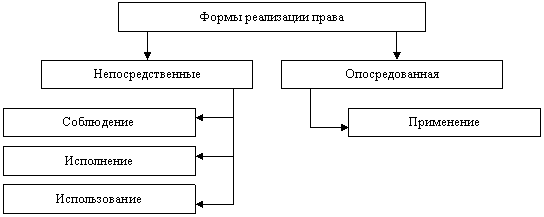 Эти три формы реализации права, в ходе которых юридические нормы претворяются в жизнь непосредственно действиями самих субъектов общественных отношений, принято называть формами непосредственной реализации права. Непосредственная реализация права может осуществляться субъектами как в рамках правоотношений (участие в выборах, служба в вооруженных силах), так и вне их (отказ от использования избирательного права, несовершение убийств и т. д.).