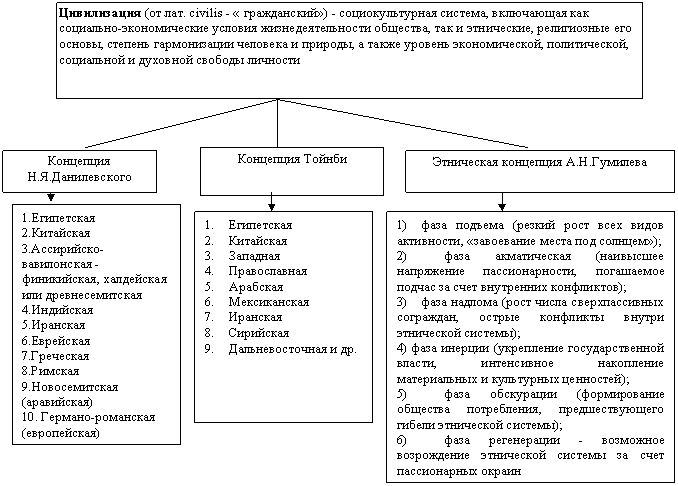 Понятие цивилизации Тойнби формулирует как относительно замкнутое и локальное состояние общества, отличающееся общностью религиозных, психологических, культурных, географических и иных признаков, два из которых остаются неизмененными: религия и формы ее организации, а также степень удаленности от того места, где данное общество первоначально возникло. Из многочисленных «первоцивилизаций», считает Тойнби, сохранились лишь те, которые смогли последовательно освоить жизненную среду и развить духовное начало во всех видах человеческой деятельности (египетская, китайская, иранская, сирийская, мексиканская, западная, дальневосточная, православная, арабская и т. д.) Каждая цивилизация придает устойчивую общность всем государствам, существующим в ее рамках.
