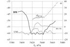 На рис 1. показаны зависимости максимальной интенсивности спектральных максимумов ИРИ (DM, UM, BUM), а также отстройки BUM от частоты ВН при вертикальном воздействии (а), а также при наклонах диаграммы стенда на юг (к направлению геомагнитного поля, 19,5º к вертикали) на 12º (б) и 16º (в).