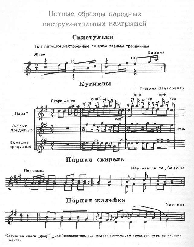 Давно уже узаконили свое положение в русском народном оркестре такие духовые инструменты, как флейта и гобой. Они очень близки по колориту русским народным духовым инструментам — свирели и брелке, но превосходят их благородством тембров и полнотою диапазонов. И тем не менее истинное украшение любого оркестра народных инструментов всегда составляют подлинные народные инструменты, в том числе и духовые. Даже один-два таких инструмента придают звучанию оркестра неповторимый колорит. Узость диапазона и техническая ограниченность с лихвой окупаются их оригинальностью и самобытностью. Что касается якобы существующих трудностей их изготовления и обучения игре на них, то это сильно преувеличено. У наших далеких предков не было ни токарного станка, ни музыкального образования, а инструменты всегда были под руками, и играли они на них отменно.