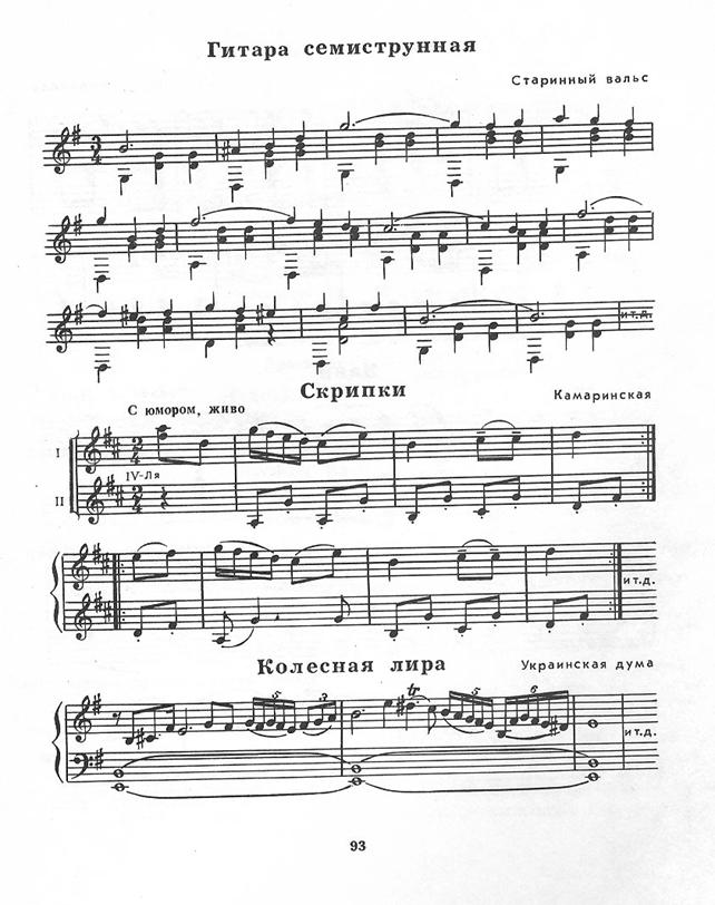 Сразу же оговоримся, что одной из особенностей народных оркестров, как и вообще народного искусства, является их разнообразие, нестандартность. К числу обязательных инструментов по-прежнему относятся группы домр и балалаек. Прочное и постоянное место заняли теперь и баяны (одна-две партии) или почти равнозначные им оркестровые гармонии: сопрано, альт, баритон (или бас) и контрабас. Их отличие от баянов в том, что они сконструированы специально для игры в оркестре и имеют лишь одну клавиатуру для правой руки. Тембр их более мягок, как бы слегка приглушен, что соответствует всему негромкому, камерному звучанию русского народного оркестра. Не следует пренебрегать группой ударных инструментов, украшающих любой оркестр, тем более народный. Сейчас одинаково широко используются как обычные, общепринятые ударные инструменты, такие, как треугольник, бубен, тарелки, малый и большой барабаны, колокольчики, ксилофон, так и самобытные национальные инструменты, описанные в нашей книге.