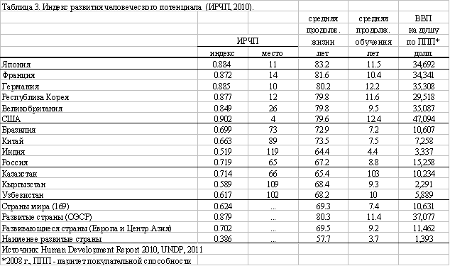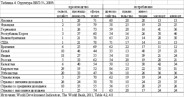 ü Уровень жизни (таблица 3) – места в первой двадцатке стран по индексу человеческого развития (human development index – средняя из индексов ВВП, продолжительности жизни и образования), 1-е место в мире по продолжительности жизни. Структура ВВП (таблица 4) – услуги как основной сектор, сравнительно высокая доля промышленности в производстве ВВП, низкая доля потребления домашних хозяйств и высокая доля валовых инвестиций в потреблении ВВП.