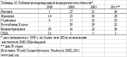ü Международная конкурентоспособность (таблица 9,10) – 1-е место в мире в 1989 г. по рейтингу института IMD, резкое падение конкурентоспособности в 1990-х и неоднозначные тенденции в 2000-х гг.