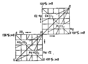 Находящиеся в нижнем квадрате воды сульфатно-натриевого и гидрокарбонатнонатриевого типов соответствуют континентальной обстановке, находящиеся в верхнем квадрате воды хлормагпиевого типа — морской, а хлоркальциевого типа — глубинной обстановке формирования. Воды каждого типа по преобладающим анионам разделяются на группы (гидрокарбонатные, сульфатные, хлоридные), по соотношению между ионами — на классы и по преобладающим катионам — на подгруппы (кальциевые, магниевые, натриевые). г. т. п. в. — формальный признак распределения вод. При незначительном изменении показателей rNa/rCl или (r Cl — rNa)/rMg вода может быть ошибочно отнесена к другому генетическому тину.
