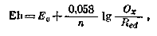 где Eh — величина О. в. п. среды; E0 — нормальный О. в. п., при котором концентрация окислительной и восстановительной частей равны между собой; Ох — концентрация окислительной формы соединения; Неа — концентрация восстановительной формы соединения; п — число электронов, участвующих в окислении или восстановлении.
