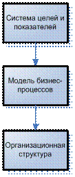 Управлять – значит приводить объект управления в целевое состояние. Исходя из этого определения можно выделить основные элементы системы управления организацией. Целевое состояние объектов управления задает система целей и показателей, деятельность по приведению объектов управления в нужное состояние описывается с помощью модели бизнес-процессов, исполнители этой деятельности определяются организационной структурой (Рис.1. Элементы системы управленияРис.1):