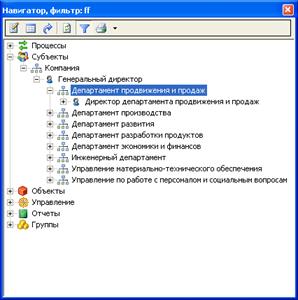 Организационная структура в Business Studio содержит иерархический перечень должностей и подразделений компании. Данный перечень необходим для назначения Владельцев и Исполнителей процессов. Организационная структура вводится в специальном справочнике Субъекты, доступ к которому находится в разделе «Субъекты» Навигатора (Рис.26):