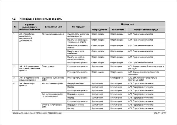 В Табл.2, Табл.3 и Табл.4 приведены основные параметры, которые необходимо заполнять для получения документов, регламентирующих деятельность подразделения и его сотрудников.