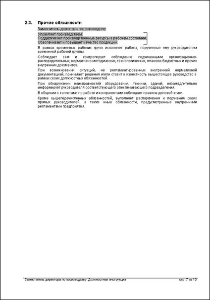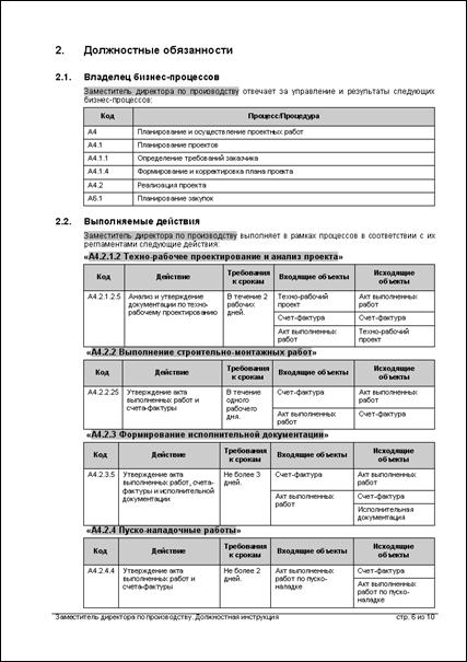 Должностные обязанности – дополнительные к обязанностям по исполнению бизнес-процессов, указанных в модели бизнес-процессов, и к обязанностям, которые указаны в шаблоне регламента «Должностная инструкция». |