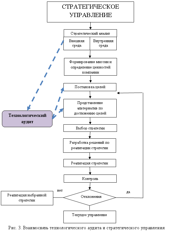 Технологический аудит ориентирован на перспективное развитие предприятия, поэтому следует проанализировать его взаимосвязь со стратегическим управлением, которое связано преимущественно с долгосрочными планами организации. Результат анализа представлен в виде схемы на рис. 3.