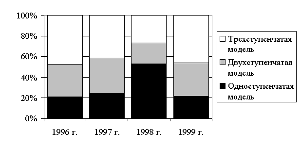 Сравнительный анализ схем позволяет сделать вывод о том, что модель, показанная на рис. 4, является одноступенчатой, при которой заемщик напрямую участвует во всех операциях. Схема, показанная на рис. 5, является двухступенчатой, когда заемщик проходит все процедуры как бы повторно. Схема, представленная на рис. 6, может быть признана трехступенчатой, в которой помимо ипотечных присутствуют также гарантийные процедуры. Экспертная оценка структурного состава схем отечественных кредитов представлена на рис. 7. По данным диаграммы можно заключить, что в настоящее время наиболее распространенной является трехступенчатая модель ипотечного кредитования, вместе с тем, проследить определенную тенденцию в структуре нельзя.