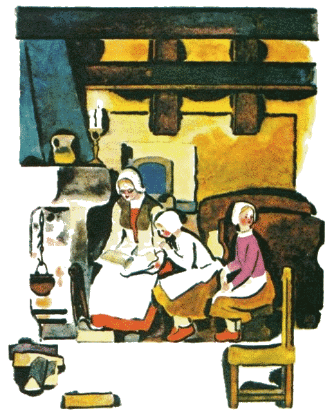 Они садились потом у очага, и мать надевала очки и читала им вслух из большой книги. А девочки сидели, пряли и слушали. Рядом с ними лежал на полу ягнёнок, а сзади сидел на насесте белый голубок, спрятав голову под крыло.