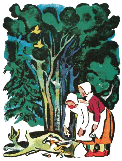 Часто девочки бегали в лесу одни, собирали спелые ягоды, но ни один зверь их не трогал, и все доверчиво подходили к ним. Зайчик ел у них с руки капустный лист, дикая коза паслась рядом с ними, весело прыгал около них олень, и птицы оставались сидеть на ветках и распевали разные песни, какие только знали. И ни разу никакой беды с сёстрами не случалось. Если они, бывало, в лесу задержатся и наступит уже ночь, они лягут рядом на мягком мху и спят так до утра; мать знала об этом и никогда о них не беспокоилась. Однажды заночевали они в лесу, проснулись на рассвете, видят – сидит рядом с ними чудесное дитя в белом сверкающем платьице. Оно встало и ласково на них поглядело, но ничего им не сказало и ушло в глубину леса. Оглянулись они и увидели, что спали они как раз на самом краю пропасти и, должно быть, упали бы в неё, если бы в темноте сделали хоть один шаг. И вот мать им объяснила, что то, должно быть, был ангел, охраняющий добрых детей.