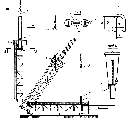 Подъем конструкций методом поворота осуществляют падающей стрелой или шевром и с помощью вспомогательной мачты (рис.13).