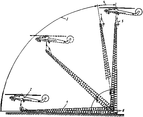 При монтаже высотных сооружений в труднопроходимых районах, например при монтаже опор ЛЭП в горных районах, их подъем методом поворота вокруг опорного шарнира может быть осуществлен вертолетом (рис.14). В этом случае вертолет должен иметь приспособление для дистанционного освобождения поднимаемой конструкции от подвеса. Вертолет поднимает башню по траектории 3 и затем на траектории 4 производит ее торможение. Этим методом можно поднимать опоры высотой 40...100 м и массой до 40 т. При монтаже башен высотой 80...100 м в подъеме участвуют два вертолета, причем второй вертолет, связанный с поднимаемой конструкцией длинной тягой, участвуя в ее повороте до угла 80°, отстреливает тягу и уходит из зоны монтажа.