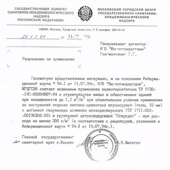 После обработки этой грунтовкой помещения повторно были обследованы Московской СЭС, и та дала добро на применение полистиролбетона.