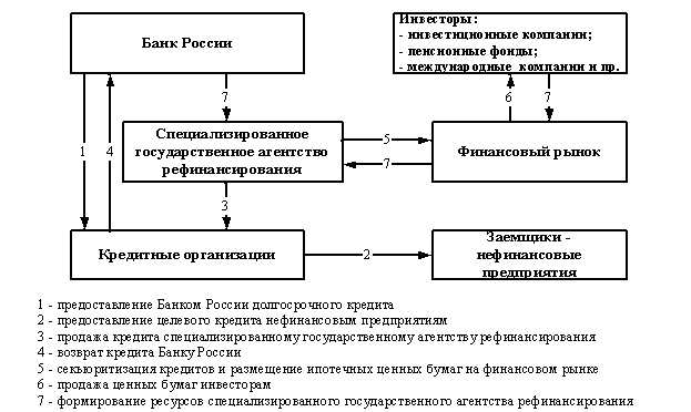 На первичном рынке осуществляется предоставление кредитными организациями целевых кредитов заемщикам - нефинансовым предприятиям за счет средств, предоставленных Банком России коммерческим банкам в рамках осуществления долгосрочного рефинансирования. На вторичном рынке предоставленных кредитов ключевую роль должно играть подконтрольное Банку России специализированное государственное агентство рефинансирования, основная цель которого заключается в рефинансировании деятельности коммерческих банков на первичном рынке. Функция рефинансирования данных кредитов может быть реализована следующими способами: