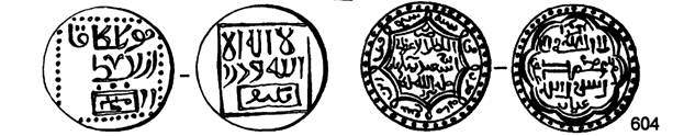 Внешне серебряные и медные монеты Золотой Орды оформлялись весьма разнообразно, причем одновременно чеканенные в разных городах монеты выглядели по-разному и были легко отличимы друг от друга. В этом существенное отличие монетного дела Золотой орды от чеканки монет в Хулагидском и Джалаиридском улусах. (№ 000, 605.)