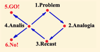 На первом этапе Problem осуществляется описание проблемной ситуации в бизнесе. Второй этап Analogia является наиболее важным и сложным, так как на нем необходимо подобрать аналогичную ситуацию в спорте. На третьем этапе Recast - придать новую форму – решение проблемной ситуации в спорте применяется по аналогии к проблемной ситуации в бизнесе. После этого выполняется Analis - анализ и оценка возможных последствий данного решения. По результатам анализа выбирается один из трех вариантов: