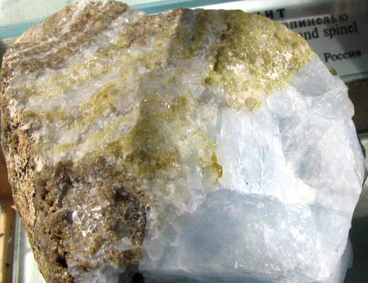 Кальцит (голубой), везувиан, волластонит. Везувиановый холм, Кедабек, Азербайджан. . Образец: ФМ (№ 000, , 1939). Фото: © .