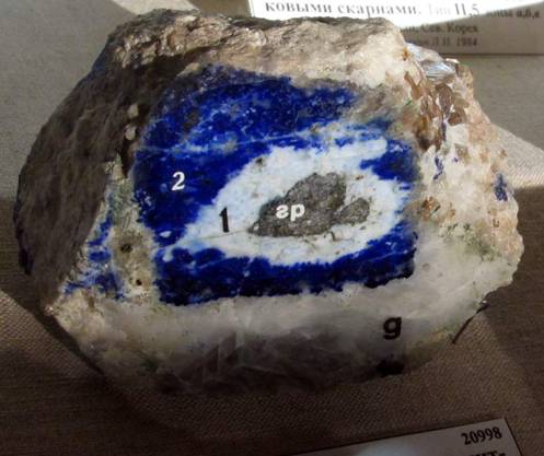 Лазурит. Зональные скарны на контакте гранитных пегматитов (гр) и доломита (g). Лазоревая р., приток р. Мал. Быстрая, Слюдянка (район), Прибайкалье (ЮЗ), Россия. Образец: ФМ (№ 000. Пост. 1925 г.). Фото: © .