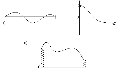 Возможен также случай упруго закрепленных концов (рис.4, в), когда к колечкам приложены упругие силы, стремящиеся вернуть концы в равновесные положения. Эти силы подчиняются закону Гука*: