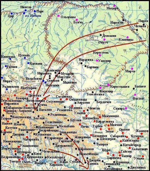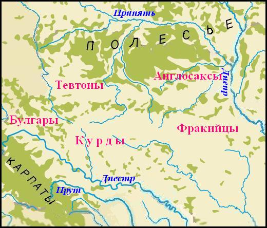 Вдоль левого берега Днестра полоса курдских топонимов тянется до самого Могилева Подольского, а дальше поворачивает на Гайсин, и после Умани она превращается в разряженную сеть в правобережной лесостепи.