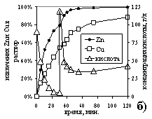 Вначале, пока концентрация H2SO4 высока, идет интенсивное выщелачивание по реакции: MeS+½O2+H2SO4àMeSO4+So+H2O. Содержание Zn и Cu в растворе резко увеличивается, кислоты – снижается (0'à10' на рис.1а; 0'à30' на рис.1б).