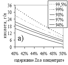 Кроме того, по результатам экспериментов была определена количественная зависимость глубины разложения пирита от глубины разложения сфалерита. Эта эмпирическая функция была использована при математическом моделировании технологии двустадиального автоклавного выщелачивания. Расчетная зависимость содержания кислоты в растворе, направляемом с передела АОВ на очистки, от качества концентрата и степени извлечения Zn показана на рис. 9.