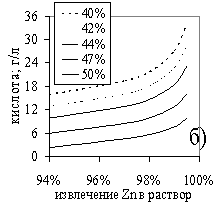 Рис. 9. Расчетная концентрация кислоты в растворе НКВ. В легенде: a) – извлечение Zn в раствор; б) – содержание Zn в концентрате