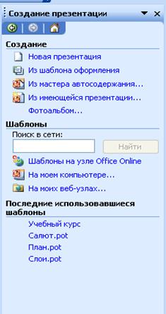 Все перечисленные способы доступны в окне PowerPoint в Области задач – Создание презентации (рисунок 5.1).