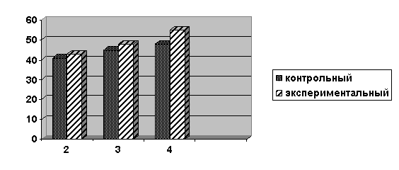 По рисунку мы видим, как из года в год растет количество ошибок в работах учащихся. Это и понятно, ибо количество изучаемых орфограмм увеличивается с каждым годом. К концу четвертого класса ученик должен знать около 35 правил орфографии. Проведенный эксперимент констатирует, что учащиеся 2, 3 и 4 контрольных классов допустили по 41, 46 и 48 ошибок суммарно. А учащиеся тех же экспериментальных классов по 42, 48 и 55 ошибок. Как видим, ощутимой разницы между классами до обучающего эксперимента не наблюдается.