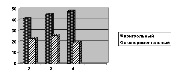 Рис. 2 Гистограмма, отражающая количество грамматических ошибок, допущенных учащимися контрольного и экспериментального класса после формирующего эксперимента