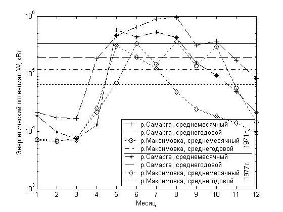 Изменения энергетического потенциала ЭГС для рек Самарга и Максимовка на восточном побережье Приморья (данные по расходу 1971 и 1977 годов) приведены на рис. 1. Изменение энергетического потенциала ЭГС в разные по водности годы на примере устья реки Максимовки приведено на рис.2.
