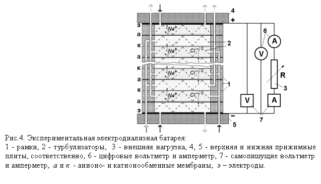 Основным элементом ЭЭУ является электродиализная батарея (рис. 4), которая представляет собой помещенный между электродами пакет из чередующихся анионо - и катионообменных мембран, разделенных рамками с вложенными в них турбулизаторами. Растворы с разной концентрацией подаются в камеры, образованные парами мембран и рабочими рамками, таким образом, что камеры с растворами высокой и низкой концентрации чередуются. Направленное движение ионов из камер с высокой концентрации в камеры с низкой концентрацией приводит к накоплению электрического потенциала на электродах.