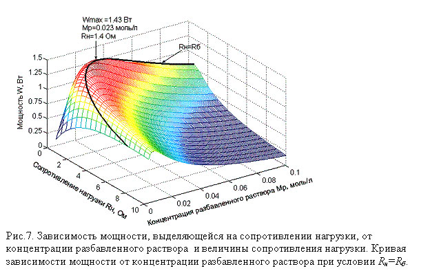 Рис.7. Зависимость мощности, выделяющейся на сопротивлении нагрузки, от концентрации разбавленного раствора и величины сопротивления нагрузки. Кривая зависимости мощности от концентрации разбавленного раствора при условии Rн=Rб.