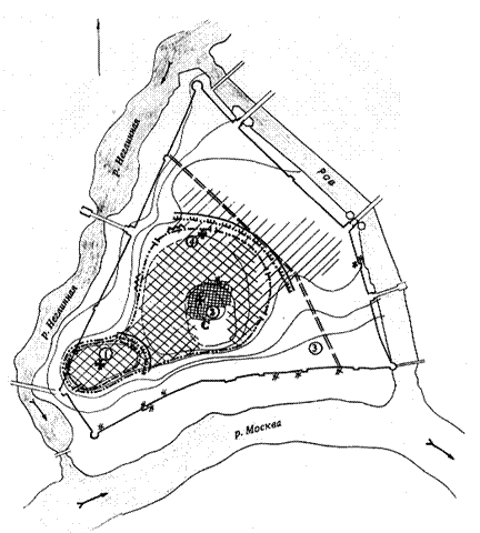 Боровицкий холм (50), где, по общему мнению исследователей, возникло Боровицкое городище, расположен в юго-западной оконечности Кремля, мысовая часть которого располагалась на наиболее высоких отметках. Раскопки гг. показали, что поселок дофеодального времени мог располагаться у южной бровки холма на высокой, отрезанной оврагами и промоинами верхней надпойменной террасе Москвы-реки.