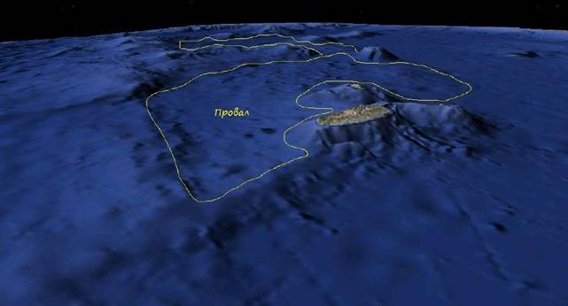 Если посмотреть на современный остров, то отчетливо видно, какие провалы образовались в прошлом. Этому способствовало первичное самообрушение равнинной плоскости острова (… после этого море в тех местах стало вплоть до сего дня несудоходным и недоступным по причине обмеления, вызванного огромным количеством ила, который оставил после себя осевший остров…) под действием собственного веса и давления налегающей толщи, вызвавшее тем самым землетрясение и вулканическое извержение. Вулкан изверг из себя потоки лавы и просел под ее массой. В момент погружения на поверхности океана образовалось огромное количество плавучих предметов и изделий, которые разнесло почти по всему океану, и в дальнейшем все эти предметы утонули.