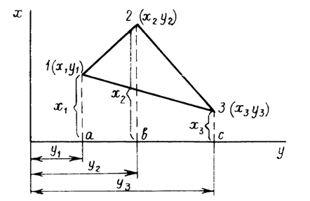 Расчетная формула для определения площади многоугольника (в простейшем случае треугольника – рис. 13):
