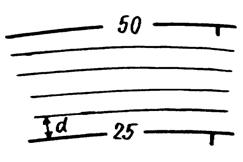 Расстояние между горизонталями в плане d называется заложением горизонталей (см. рис. 22).