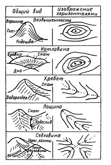 В каждом виде рельефа выделяют пять основных форм: возвышенность, котловину, хребет, лощину и седловину (рис. 23).