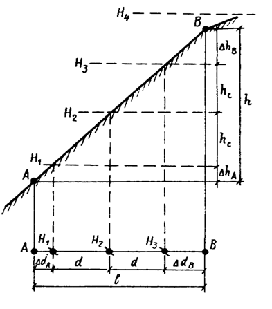 При съемке рельефа характерные точки (А, В или ACD и т. д.) выбирают там, где уклон ската меняет величину или направление. Чем меньше hc (чем крупнее масштаб), тем больше требуется принимать характерных точек рельефа. После нанесения характерных точек с известными отметками на лист бумаги отыскание местоположения точек, принадлежащих определенной горизонтали, производят интерполированием: аналитически, графически или на глаз. При любом способе интерполирования необходимо определить величину трех различных отрезков (рис. 26): DdA; d; DdB. Пусть имеем на плане две соседние точки А и В. Их отметки таковы, что при данной hc между этими точками пройдут три горизонтали с отметками H1, H2, H3.