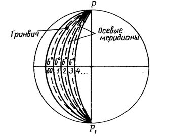 В поперечно-цилиндрической проекции искажения будут в длинах линий: зоны на цилиндре получаются более широкими, чем на шаре. Не будет никаких искажений осевого меридиана – он касается поверхности цилиндра, но чем дальше расположены отрезки от осевого меридиана, тем больше искажений в длинах линий.