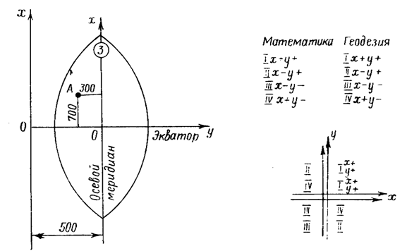 В проекции Гаусса за начало координат в каждой зоне принимают точку пересечения осевого меридиана с линией экватора, которые образуют прямой угол. Они и есть в данном случае оси координат (рис. 38). Осевой меридиан служит осью абсцисс x, а линия экватора – осью ординат у. Положительным направлением абсцисс считается направление от экватора к северу, положительным направлением ординат – на восток. В математике применяется левая система координат (нумерация четвертей против движения часовой стрелки), в геодезии – правая система. Но так как наименования осей координат тоже противоположны, знаки координат точек, расположенных в одноименных четвертях, совпадают (см. рис. 38), что позволяет применять формулы тригонометрии без всяких изменений и в данной системе.