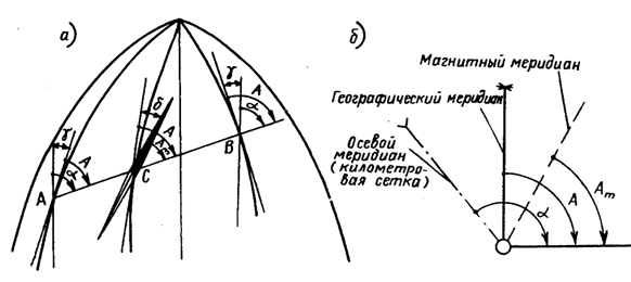 На рис. 39,а показан географический азимут для линии ВС (пунктирная линия – направление географического меридиана в точке В).