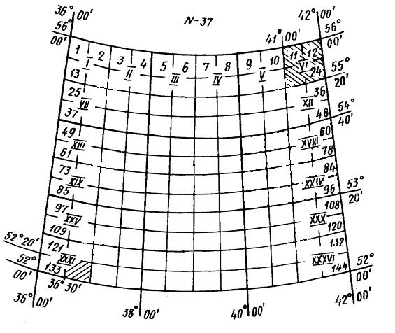 Разграфка листов карт масштабов 1:200 000 и 1:100 000 производится путем деления каждого листа карты масштаба 1:1 000 000 меридианами и параллелями соответственно на 36 и 144 части (рис. 47). Листы карт масштаба 1:200 000 нумеруются римскими цифрами, масштаба 1:100 000 – арабскими цифрами по рядам с запада на восток.