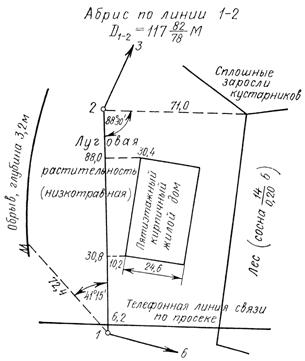 Все построения выполняют предельно тонкими линиями, так как часть этих линий при последующей разработке плана будет заменяться на точечный пунктир, линии вспомогательных построений должны быть убраны. Значения углов и длин линий, приведенные в абрисах, на план не выписывают.