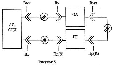 7.1.4.3 Фазовое дрожание оптического сигнала на выходе регенератора измеряется с помощью АС СЦИ, вход которого подключается к точке Пд(S) регенератора по схеме, приведенной на рисунке 5, при подаче на вход регенератора, точка Пр(R), через оптический аттенюатор (ОА) сигнала, в котором отсутствует фазовое дрожание. С помощью ОА устанавливается затухание между выходом АС СЦИ и входом регенератора в пределах диапазона перекрываемого затухания в соответствии с кодом применения по ОСТ 45.104.
